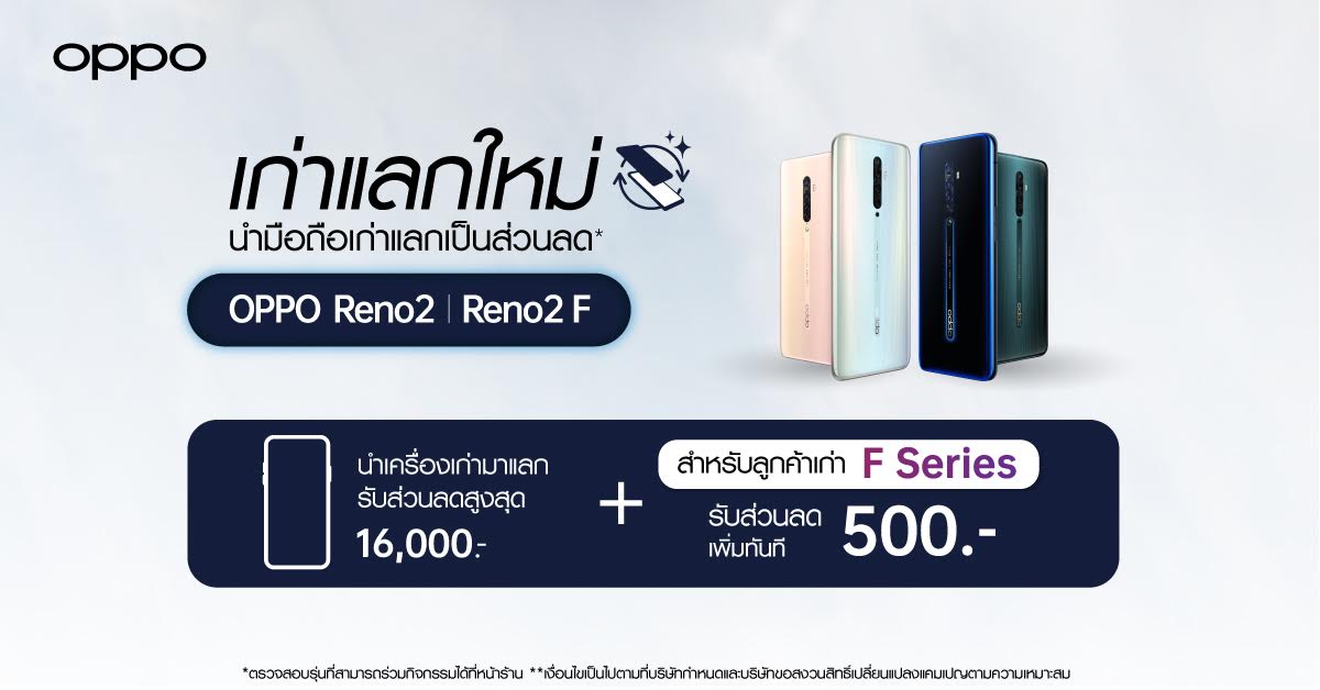 OPPO จัดแคมเปญ สุดพิเศษ เก่าแลกใหม่ เอาใจผู้ใช้ เพียงนำสมาร์ทโฟน OPPO F Series มาแลกรับส่วนลดในการซื้อ OPPO Reno2 F และ OPPO Reno2 โดยผู้ใช้ OPPO F Series จะได้รับส่วนลดถึงสองส่วน จากราคาประเมินสมาร์ทโฟนเครื่องเก่า และพิเศษรับส่วนลดเพิ่มอีก 500 บาท นอกจากนี้ผู้ที่ใช้สมาร์ทโฟนรุ่นอื่นสามารถเข้าร่วมแคมเปญนี้ได้ เพียงนำสมาร์ทโฟนรุ่นใดก็ได้ มาประเมินราคาเพื่อเป็นส่วนลดในการซื้อเครื่อง โดยสามารถสอบถามรายละเอียดเพิ่มเติมได้ที่ OPPO Brand Shop BaNANA, BKK by Com7,KingKongPhoneและ Jaymart ในสาขาที่ร่วมรายการ ตั้งแต่วันนี้เป็นต้นไป