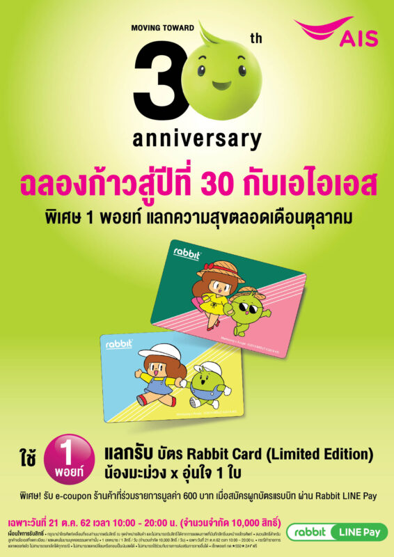 และพิเศษยิ่งกว่า ในโอกาสฉลองก้าวสู่ปีที่ 30 กับ AIS เฉพาะวันที่ 21 ตุลาคม 2562 ให้ลูกค้าสามารถใช้เพียง 1 พอยท์ แลกรับบัตร Rabbit Card ลายมะม่วง x อุ่นใจ (Limited Edition) พร้อมรับสิทธิพิเศษ e-coupon ร้านค้าที่ร่วมรายการ มูลค่า 600 บาท เมื่อสมัครผูกบัตรแรบบิท กับ Rabbit LINE Pay โดยสามารถรับสิทธิ์ได้ที่บูธบริการ Rabbit LINE Pay บนสถานี BTS ทั้ง 10 สถานี ดูรายละเอียดได้ที่ AIS Privileges LINE Official