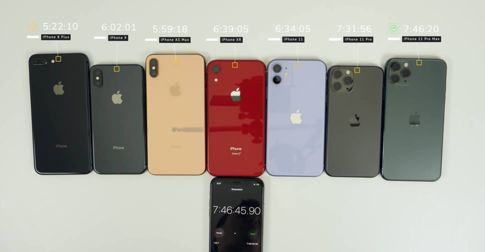 ล่าสุด iPhone 11 Pro Max ถูกนำมาทดสอบแบตเตอรี่อีกครั้งโดย Brandon Butch พร้อมเปรียบเทียบกับ iPhone 11, iPhone 11 Pro, iPhone XR, iPhone XS Max, iPhone X และ iPhone 8 Plus เพื่อหาคำตอบว่า iPhone รุ่นไหนของ Apple จะมีประสิทธิภาพในการจัดการพลังงานของแบตเตอรี่ได้ดีกว่ากัน