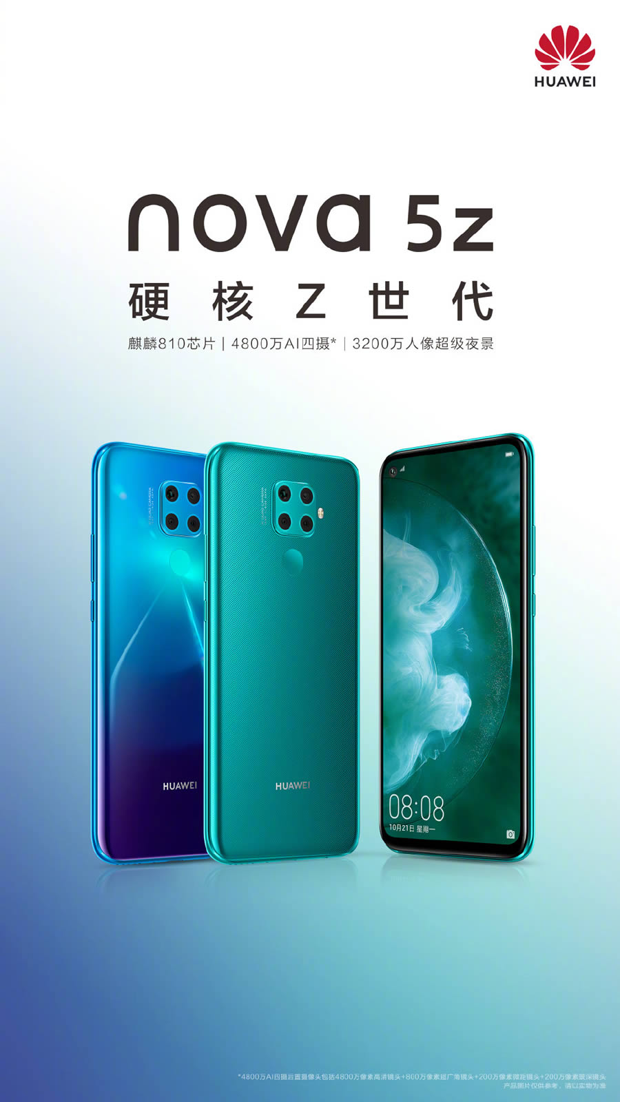 นอกจากดีไซน์ของ nova 5z จะคล้ายกับ nova 5i Pro สเปกหลักที่ระบุอยู่บนรูปภาพโปสเตอร์ก็เหมือนกันด้วย ไม่ว่าจะเป็นชิปประมวลผล Kirin 810 กล้องเซลฟี่ 32 ล้านพิกเซล และกล้องหลัง 4 ตัว ที่ประกอบด้วย กล้องหลัก 48 ล้านพิกเซล + กล้องมุมกว้างพิเศษ 8 ล้านพิกเซล + กล้องมาโคร 2 ล้านพิกเซล + กล้องจับระยะชัดลึก 2 ล้านพิกเซล