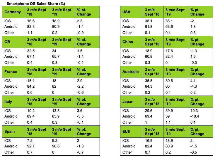 การเปิดตัวของ iPhone 11, iPhone 11 Pro และ iPhone 11 Max เพียง 1 สัปดาห์ ช่วยให้ระบบปฏิบัติการ iOS มีส่วนแบ่งเพิ่มขึ้นทั้งในยุโรป ญี่ปุ่น และ ออสเตรเลีย แต่ก็มีส่วนแบ่งในสหรัฐฯ ลดลง จาการสำรวจตลาดในไตรมาสที่ 3 ปี 2019 ของบริษัท Kantar