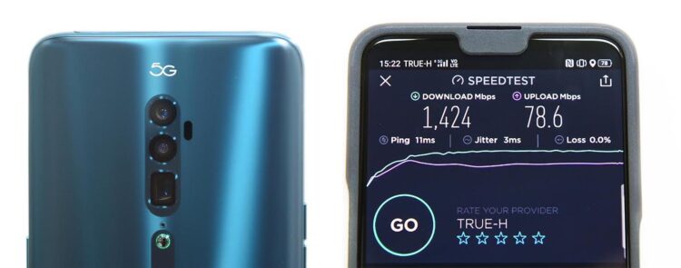 ซึ่งในเดือนสิงหาคมที่ผ่านมา OPPO ร่วมกันกับทรูมูฟ เอช ประสบความสำเร็จในการเชื่อมต่อเครือข่าย True 5G พร้อมทดสอบความเร็วในการอัพโหลดและดาวน์โหลด โดยมีความเร็วในการดาวน์โหลดสูงสุดถึง 1,424 Mbps และความเร็วในการอัพโหลดสูงสุดถึง 78.6 Mbps ถือเป็นการบ่งบอกถึงความก้าวหน้าและความสำเร็จของ OPPO ในด้านสมาร์ทโฟน และทรูมูฟ เอชในด้านผู้ให้บริการเครือข่ายในไทย รวมถึงความพร้อมในการเข้ามาของยุค 5G ด้วยความมุ่งมั่นที่จะนำเสนอประสบการณ์ด้าน 5G ให้กับผู้ใช้ในเร็วๆ นี้