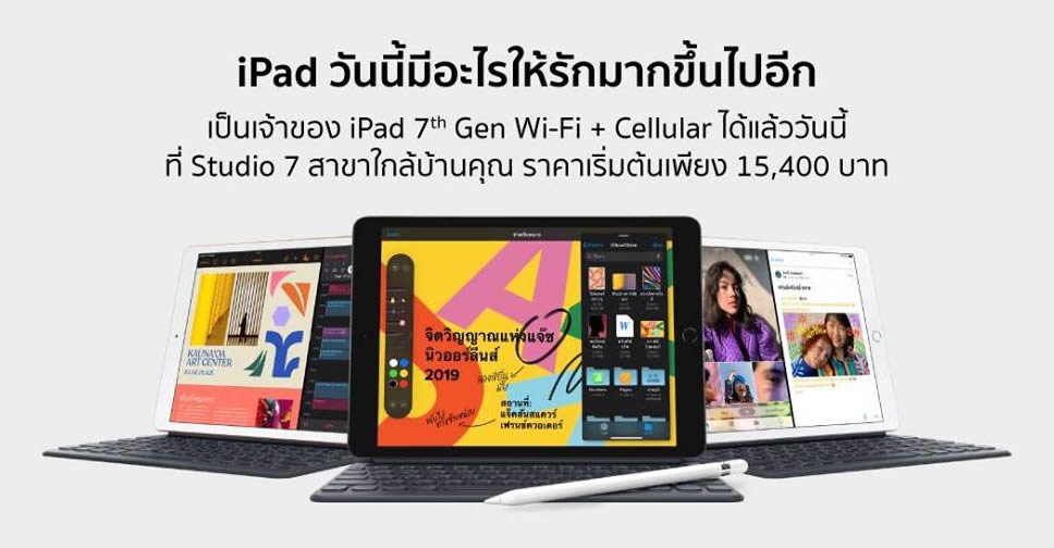 Studio 7 พร้อมวางจำหน่าย iPad 7 รุ่น Wi-Fi + Cellular อย่างทางการแล้ว ในราคาเริ่มต้น 15,400 บาท พร้อมโปรโมชั่นผ่อนสบายๆ 0% นานสูงสุด 24 เดือน (เฉลี่ยเพียงเดือนละ 642 บาท) กับธนาคารที่ร่วมรายการ