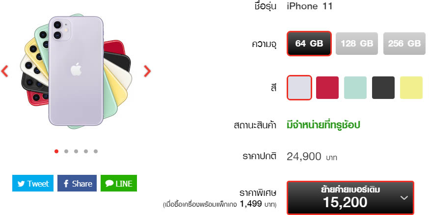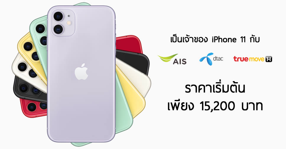Apple เริ่มวางจำหน่าย iPhone 11 ในประเทศไทยอย่างทางการแล้ว ในราคาเริ่มต้น 24,900 บาท สำหรับรุ่น 64GB แต่ถ้าใครใช้บริการรายเดือนกับทาง AIS, Dtac หรือ TrueMove H อยู่แล้ว ก็ไม่ควรพลาดการเป็นเจ้าของ iPhone 11 ในราคาพิเศษ!! เริ่มต้นเพียง 15,200 บาท โดยแต่ละค่ายมีเงื่อนไขแตกต่างกันดังนี้