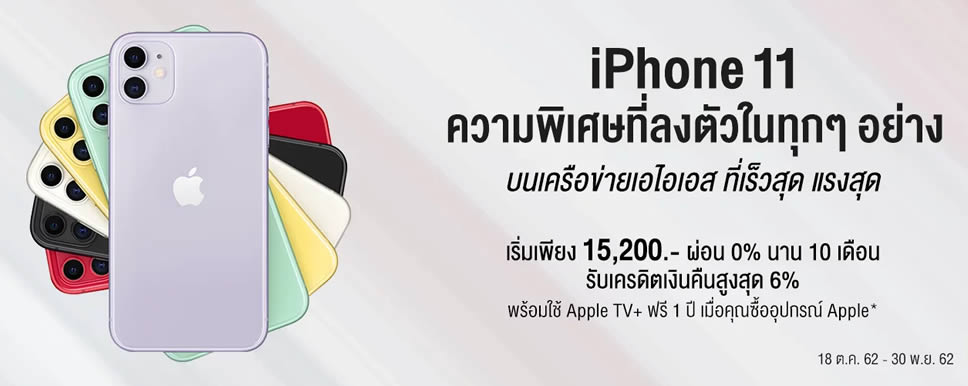 สิทธิพิเศษเมื่อซื้อ iPhone 11 กับ AIS ฟรี!! บริการ Apple TV+ นาน 1 ปี, ชมฟรี!! Warner TV และ HBO ไม่คิดค่าเน็ตนาน 3 เดือน, รับสิทธิ์ผ่อน 0% นานสูงสุด 40 เดือน พร้อมรับเครดิตเงินคืน 2% กับ Citibank Ready Credit หรือ ผ่อน 0% นาน 24 เดือน รับเครดิตเงินคืนสูงสุด 6% กับธนาคารที่ร่วมรายการ