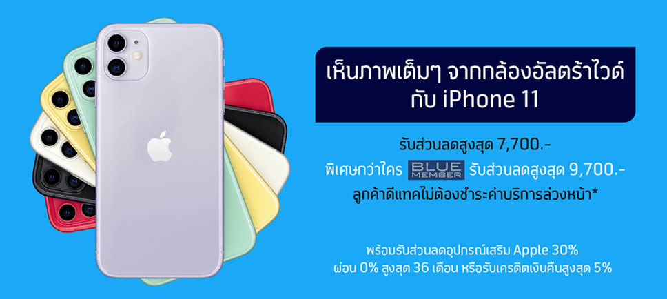 สิทธิพิเศษเมื่อซื้อ iPhone 11 กับ Dtac ลูกค้าย้ายค่ายเบอร์เดิมรับส่วนลดเพิ่ม 2,000 บาท ถึง 30 พฤศจิกายน 2562, ผ่อนสบายๆ 0% นานสูงสุด 36 เดือน รับเครดิตเงินคืนสูงสุด 5% กับธนาคารที่ร่วมรายการ, รับส่วนลดอุปกรณ์เสริม Apple 30% เมื่อซื้อคู่กับ iPhone และ ฟรี!! บริการ Apple TV+ นาน 1 ปี
