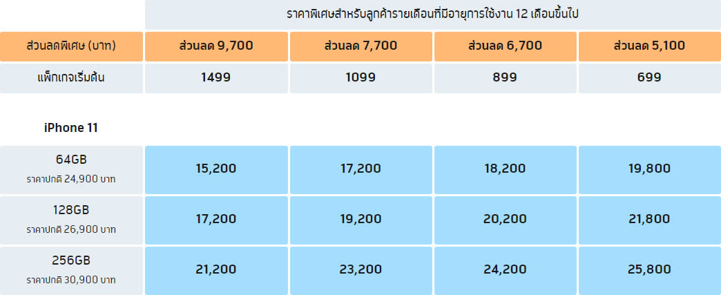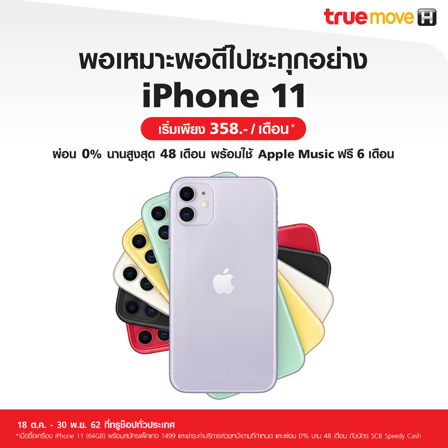 iPhone 11 จาก TrueMove H ราคาพิเศษเพียง 15,200 บาท สำหรับลูกค้าย้ายค่ายเบอร์เดิม และ ลูกค้าปัจจุบันที่มีอายุการใช้งาน 12 เดือนขึ้นไป ที่ซื้อ iPhone 11 พร้อมสมัครแพ็กเกจ 4G+ Extra Fun Unlimited 1499 ขึ้นไป และชำระค่าบริการล่วงหน้า 3,500 บาท โดยต้องทำสัญญาใช้บริการนาน 12 เดือน