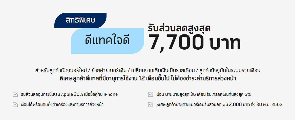 สำหรับลูกค้าเปิดเบอร์ใหม่, ย้ายค่ายเบอร์เดิม, เปลี่ยนจากเติมเงินเป็นรายเดือน, ลูกค้าปัจจุบันในระบบรายเดือน มีสิทธิ์รับส่วนลดสูงสุด 7,700 บาท พิเศษ!! ลูกค้าดีแทคที่มีอายุการใช้งาน 12 เดือนขึ้นไป ไม่ต้องชำระค่าบริการล่วงหน้า