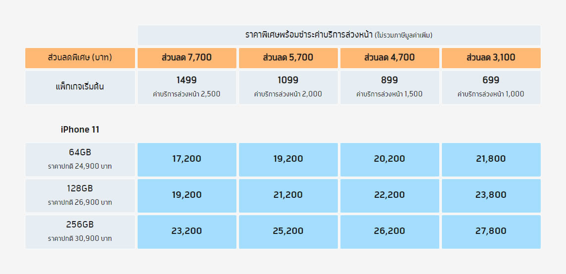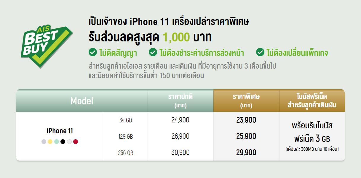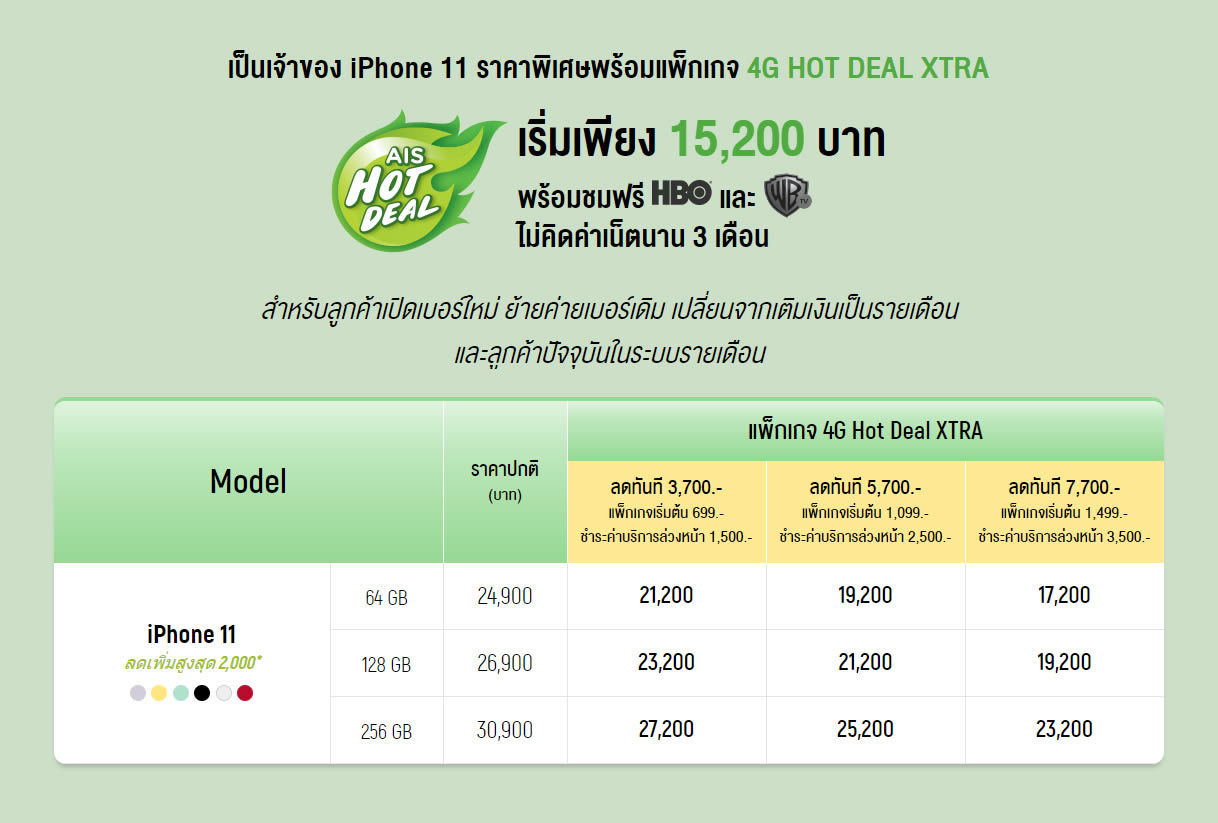 iPhone 11 จาก AIS ราคาเริ่มต้นเพียง 15,200 บาท เมื่อซื้อพร้อมสมัครแพ็กเกจ 4G Hot Deal XTRA 1,499 บาท ขึ้นไป และชำระคาบริการล่วงหน้า 3,500 บาท โดยจะได้รับส่วนลดทันที 7,700 บาท แต่สำหรับผู้ใช้บริการที่ย้ายค่ายเบอร์เดิม หรือ ผู้ใช้บริการปัจจุบันรายเดือน ที่มีอายุการใช้งาน 1 ปีขึ้นไป จะได้รับส่วนลดเพิ่มอีก 2,000 บาท