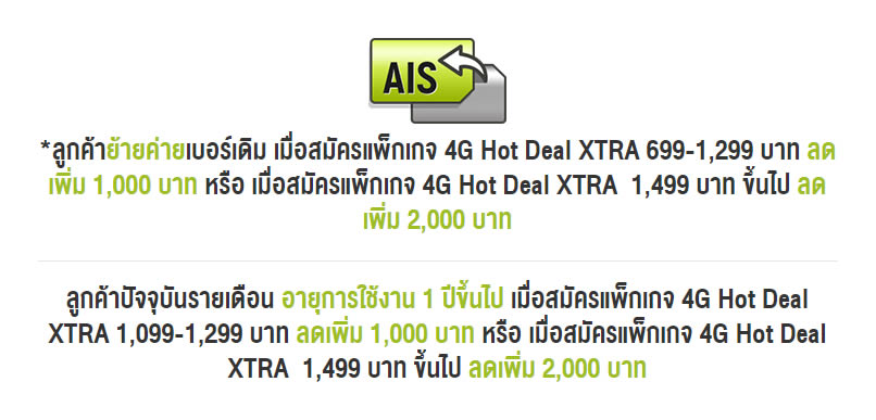 สำหรับสำหรับผู้ใช้บริการ AIS รายเดือนและเติมเงิน ที่มีอายุการใช้งาน 3 เดือนขึ้นไป และมียอดใช้บริการขั้นต่ำ 150 บาทต่อเดือน จะได้รับส่วนลดสูง 1,000 บาท พร้อมรับโบนัสเล่นเน็ต 3 GB ฟรี!! (เดือนละ 300MB นาน 10 เดือน) โดยไม่มีเงื่อนไข