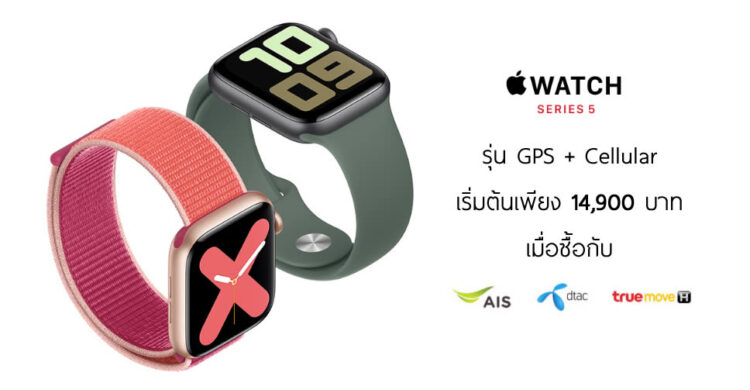 Apple Watch Series 5 รุ่น GPS + Cellular ช่วยให้ผู้สวมใส่เป็นอิสระจาก iPhone อย่างแท้จริง เพราะสามารถเชื่อมต่อกับบริการเครือข่ายโทรศัพท์เคลื่อนที่ได้โดยตรง รองรับผู้ให้บริการฯ AIS, Dtac หรือ TrueMove H และยังมาพร้อมส่วนลดสูงสุด 2,000 บาท เมื่อซื้อ Apple Watch Series 5 กับผู้ให้บริการฯ ทั้ง 3 ราย โดยมีเงื่อนไขแตกต่างกันดังนี้