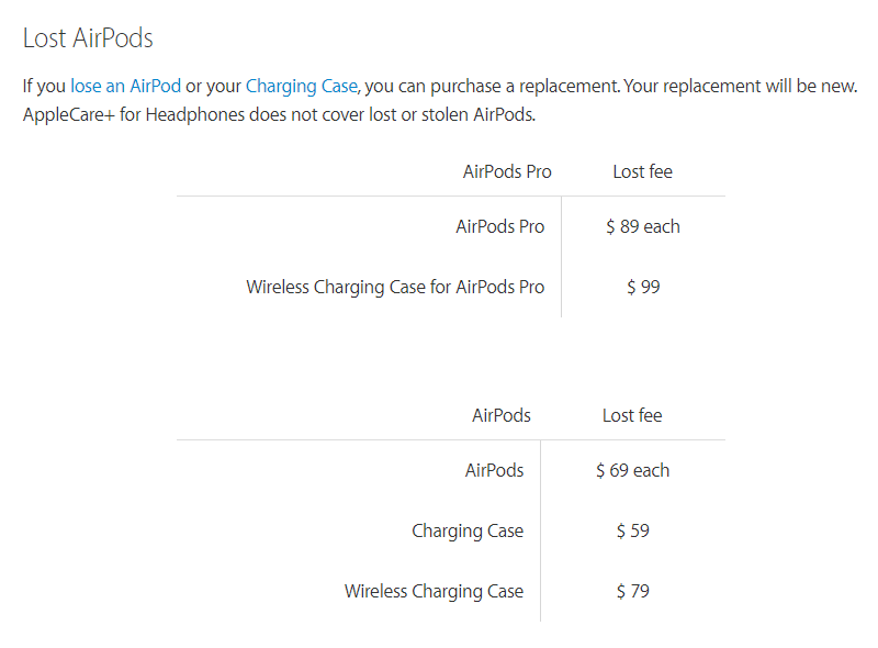 กรณีทำ AirPods Pro สูญหาย และต้องการขอรับใหม่ จะต้องจ่ายในราคา 89 ดอลล่าร์สหรัฐ หรือราว 2,900 บาท สำหรับหูฟังแต่ละข้าง ส่วนเคสชาร์จชาร์จไร้สายต้องจ่าย 99 ดอลล่าร์สหรัฐ หรือราว 3,000 บาท นั่นหมายถึง ถ้าหากโชคร้ายทำหายทั้งหมด คงต้องซื้อใหม่ เพราะจะจ่ายในราคาถูกกว่า อีกทั้ง AppleCare+ ก็ไม่คุ้มครองกรณีทำหายด้วย