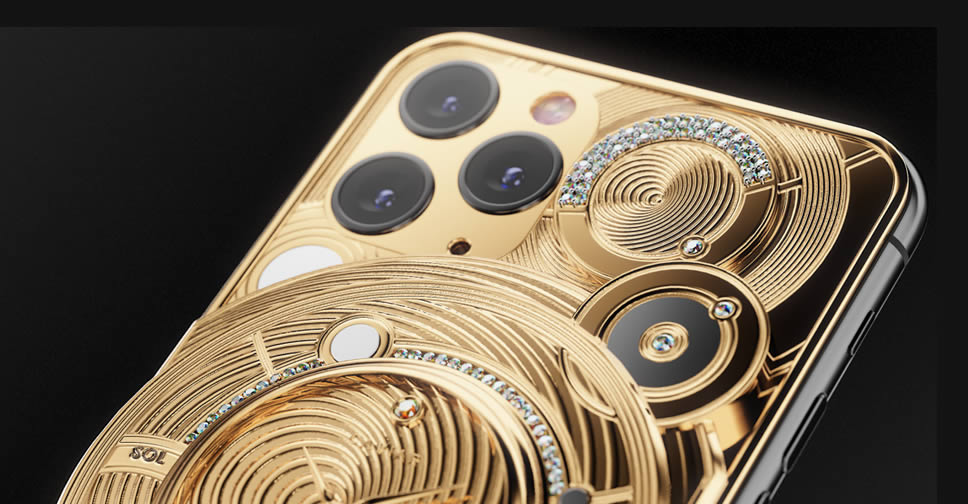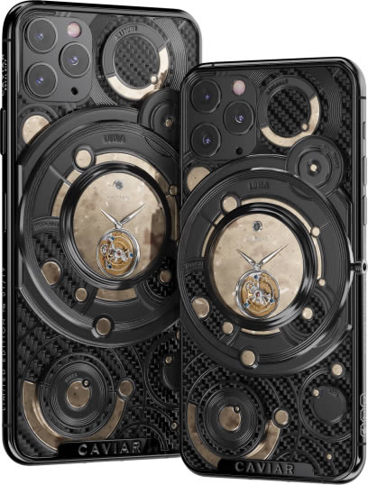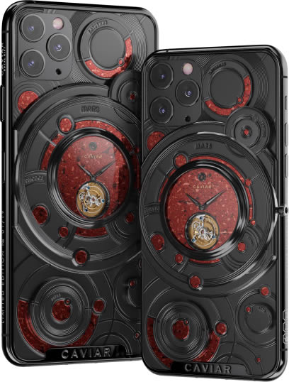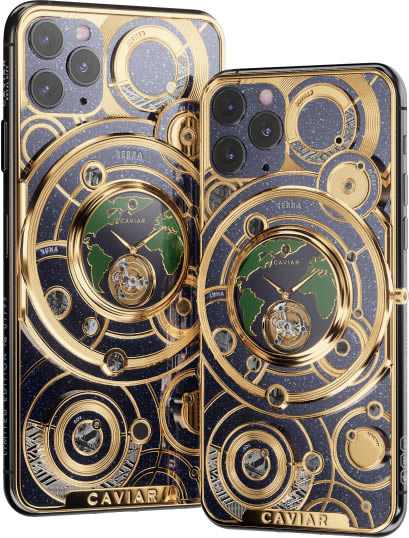 Caviar แบรนด์หรูจากรัสเซีย เปิดตัว iPhone 11 Pro รุ่นพิเศษ Discovery Solarius ซึ่งเป็นการนำ iPhone 11 Pro มาตกแต่งใหม่ให้พรีเมี่ยม ประกอบด้วยทอง 500 กรัม ประดับเพรช 137 เม็ด และด้านหลังจากติดตั้งนาฬิกาอนาล็อก ที่ใช้กลไก Tourbillon ซึ่งปกติจะพบได้ในนาฬิการาคาแพง นอกจากนี้ หน้าปัดนาฬิกายังทำมาจากเพชรสีเหลือง