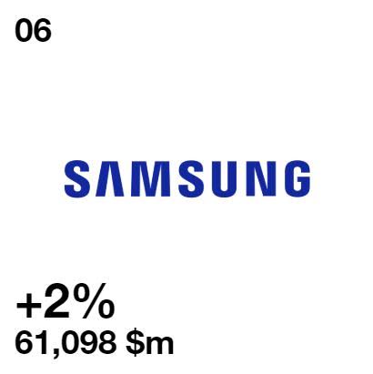 ซัมซุง อิเลคโทรนิคส์ ครองตำแหน่งอันดับ 6 สุดยอดแบรนด์ที่ดีที่สุดในโลก ประจำปี 2019 จากผลสำรวจของอินเตอร์แบรนด์ (Interbrand’s Best Global Brands 2019) ด้วยมูลค่าแบรนด์ที่ 6.11 หมื่นล้านเหรียญสหรัฐ ซึ่งเพิ่มขึ้นจากปีที่แล้ว 2% โดยปัจจัยสำคัญที่สนับสนุนการเติบโตของซัมซุงในปีนี้นั้น ประกอบไปด้วย