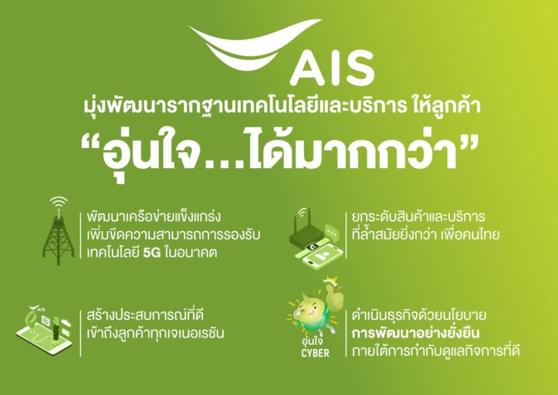 ทั้งนี้ เอไอเอส ยังคงเน้นย้ำหัวใจสำคัญของการวางรากฐานการเติบโตในอนาคต ยกระดับงานบริการเพื่อการดูแลลูกค้าให้ “อุ่นใจ…ได้มากกว่า” ใน 4 แกนสำคัญ ได้แก่