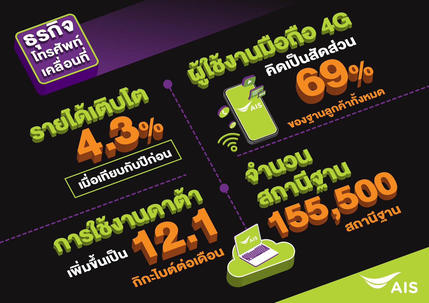 การใช้งานของลูกค้า 4G เพิ่มขึ้นอย่างต่อเนื่อง โดยปัจจุบันมีจำนวนลูกค้าโทรศัพท์มือถือมากที่สุดในตลาดอยู่ที่ 41.6 ล้านเลขหมาย และมีลูกค้า 4G จำนวน 28.5 ล้านรายมีการใช้งานดาต้าของลูกค้าเฉลี่ยเพิ่มขึ้นเป็น 12.1 กิกะไบต์ต่อเดือน ล่าสุด Ookla® Speedtest® ได้เผยผลสำรวจความเร็วเน็ตของไทย ครึ่งปีแรก 2019 จัดอันดับให้ AIS เป็นเครือข่ายมือถือและเน็ตบ้านที่เร็วที่สุดในไทย, เครือข่ายมือถือที่ครอบคลุมมากที่สุดในไทย และเครือข่ายมือถือที่ดีที่สุดในไทย เป็นการการันตีคุณภาพเครือข่ายและการบริการที่เหนือคู่แข่ง เพื่อส่งมอบประสบการณ์ที่ดีที่สุดให้ลูกค้าและคนไทย