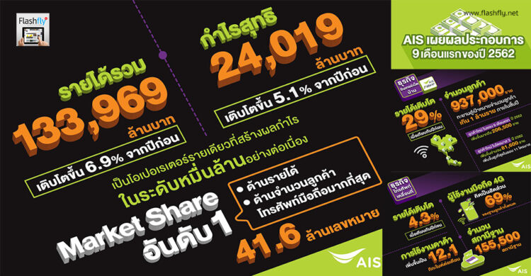 AIS โชว์ผลประกอบการช่วงเก้าเดือนแรก ปี 2562 เติบโตแข็งแกร่งต่อเนื่อง มีรายได้จากการให้บริการหลัก รวมอยู่ที่ 104,883 ล้านบาท เติบโตขึ้น 5.2% ส่งผลให้มีกำไรสุทธิ 24,019 ล้านบาท เติบโตขึ้น 5.1% จากปีก่อน โดยมี Market Share เป็นอันดับ 1 ทั้งด้านรายได้ และจำนวนลูกค้าโทรศัพท์มือถือที่มากที่สุด 41.6 ล้านเลขหมาย เผยธุรกิจเน็ตบ้าน AIS Fibre โตไม่หยุด เฉพาะในไตรมาส 3 มีลูกค้าเพิ่มขึ้นสูงที่สุดในรอบ 11 ไตรมาสที่ผ่านมา มีลูกค้าปัจจุบันที่ 930,700 ราย ตอกย้ำความสำเร็จผู้นำอันดับ 1 ตัวจริงของอุตสาหกรรมที่สร้างผลกำไรสูงสุดต่อเนื่องในระดับหมื่นล้าน และดำเนินธุรกิจโดยคำนึงถึงผู้มีส่วนได้เสียทุกกลุ่ม พร้อมมุ่งพัฒนานวัตกรรมและเตรียมความพร้อมองค์กรสู่ยุค 5G ในอนาคต
