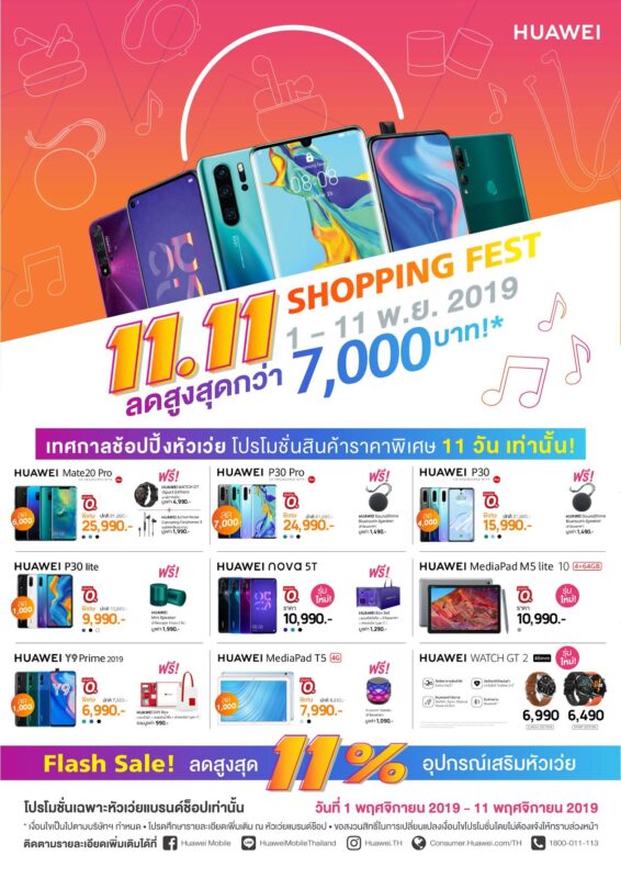 HUAWEI Shopping Fest โปรโมชั่นเดือนที่สอง แบบจัดเต็ม 11 วัน เริ่มวันนึ้ – 11 พฤศจิกายนนี้พบกับสมาร์ทโฟนเรือธง แท็บเล็ต และแกดเจ็ตรุ่นใหม่ที่หัวเว่ยจัดขบวนมาร่วมโปรโมชั่นกันแบบจุใจ