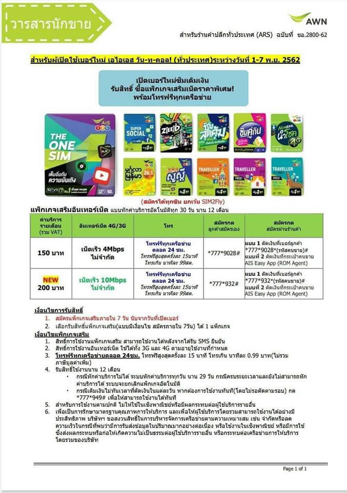 ผู้ใช้บริการที่เปิดเบอร์ใหม่ในระบบเติมเงินของ AIS ตั้งแต่วันนี้ ถึงวันที่ 7 พฤศจิกายน 2562 มีสิทธิ์สมัครแพ็กเก็จเสริมเพื่อรับอินเตอร์เน็ต 3G หรือ 4G ความเร็วสูง 10Mbps แบบไม่อั้น ไม่ลดความเร็ว