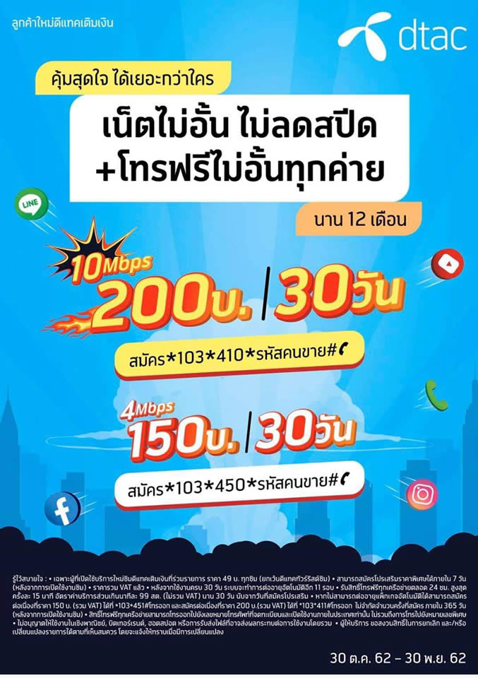 ผู้ใช้บริการที่เปิดเบอร์ใหม่ในระบบเติมเงินของ Dtac ตั้งแต่วันนี้ ถึงวันที่ 30 พฤศจิกายน 2562 มีสิทธิ์สมัครแพ็กเก็จเสริมเพื่อรับอินเตอร์เน็ต 3G หรือ 4G ความเร็วสูง 10Mbps แบบไม่อั้น ไม่ลดความเร็ว พร้อมได้โปรโมชั่นโทรฟรี!! ทุกเครือข่าย ตลอด 24 ชั่วโมง ครั้งละ 15 นาที (โทรเกินคิดนาทีละ 99 สตางค์ ไม่รวมภาษีมูลค่าเพิ่ม) เช่นเดียวกัน