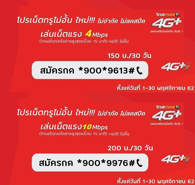 ผู้ใช้บริการที่เปิดเบอร์ใหม่หรือย้ายค่ายเบอร์เดิมมาในระบบเติมเงินของ TrueMove H ตั้งแต่วันนี้ ถึงวันที่ 30 พฤศจิกายน 2562 ก็ได้รับโปรโมชั่นอินเตอร์เน็ตและโทรฟรีเช่นเดียวกับ AIS และ Dtac แต่จะได้รับ WiFi ไม่จำกัดด้วย สำหรับโปรโมชั่นโทรฟรี!! ทุกเครือข่าย ตลอด 24 ชั่วโมง จะจำกัดครั้งละ 15 นาที และสายจะหลุดโดยอัตโนมัติ ป้องกันการโทรเกิน