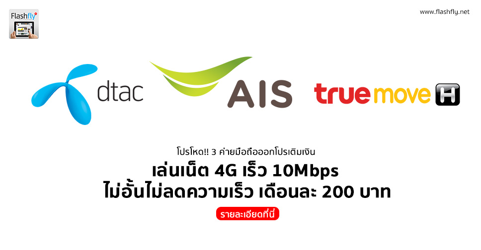 ผู้ให้บริการเครือข่ายฯ รายใหญ่ทั้ง 3 ราย AIS, Dtac และ TrueMove H งัดโปรโมชั่นเด็ดออกมาเอาใจลูกค้าในระบบเติมเงิน โดยมีเงื่อนไขที่คล้ายกัน จ่ายเพียงเดือนละ 200 บาท ได้รับแพ็กเก็จใช้งานอินเตอร์เน็ต 3G หรือ 4G ความเร็วสูง 10Mbps แบบไม่อั้น ไม่ลดความเร็ว