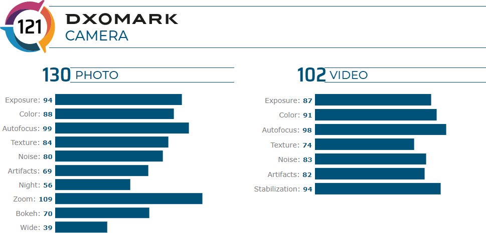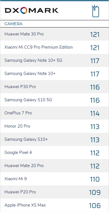 121 เป็นคะแนนรวม ที่ Xiaomi Mi CC9 Pro และ Huawei Mate 30 Pro ทำได้ ถ้าหากแยกเป็นคะแนนเฉพาะการถ่ายภาพนิ่ง Mi CC9 Pro ได้รับ 130 คะแนน ขณะที่ Mate 30 Pro ได้รับ 131 คะแนน แต่ในการถ่ายวีดีโอ Mi CC9 Pro ทำได้ 102 คะแนน เหนือกว่าเรือธงของ Huawei เล็กน้อย