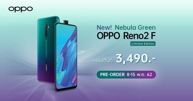 OPPO Reno2 F Nebula Green Limited Edition พร้อมพรีออเดอร์ได้ตั้งแต่วันที่ 8 – 15 พฤศจิกายน นี้ ในราคา 11,990 บาท พร้อมรับฟรี Special gift จาก OPPO มูลค่า 4,799 บาท และพิเศษสุดๆ สำหรับผู้ที่พรีออเดอร์ผ่านผู้ให้บริการเครือข่ายที่ร่วมรายการสามารถเป็นเจ้าของ OPPO Reno2 F Nebula Green Limited Edition ในราคาเริ่มต้นเพียง 3,490 บาท