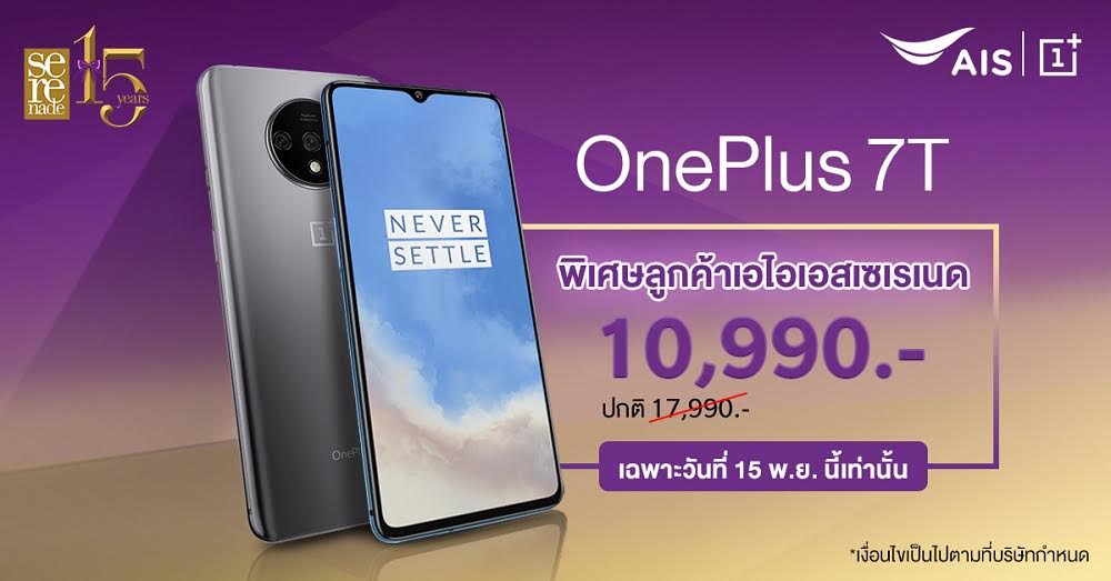 สุดพิเศษฉลองครบรอบ 15 ปี เอไอเอส เซเรเนด รับโปรโมชันเฉพาะลูกค้าเซเรเนด รับไปเลยส่วนลดค่าเครื่อง OnePlus 7T รุ่น RAM 8 GB + ROM 128 GB สี Glacier Blue หรือ Frosted Silver จากราคา 17,990 เหลือเพียง 13,490 บาท เมื่อใช้แพ็กเกจที่มีค่าบริการรายเดือนตั้งแต่ 1,099 บาทขึ้นไป