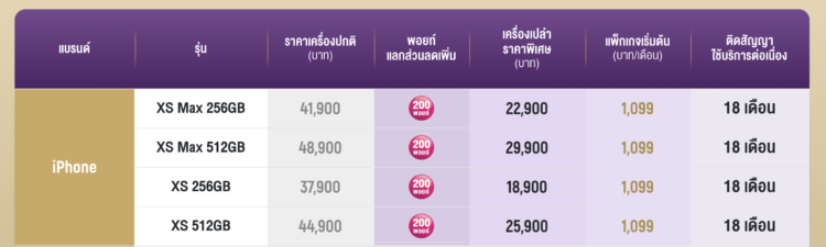 - ไม่ต้องจ่ายค่าบริการล่วงหน้า ไม่ต้องเปลี่ยนแพจเกจ สำหรับลูกค้าที่มีแพ็กเกจขั้นต่ำ 899 หรือ 1,099 หรือ 1,499 บาท ขึ้นไป ตามที่กำหนดในแต่ละรุ่น หลังหักส่วนลดตามรายการส่งเสริมการขาย หรือสมัครใช้แพ็กเกจ 899 หรือ 1,099 หรือ 1,499 บาท ตามที่กำหนดในแต่ละรุ่น