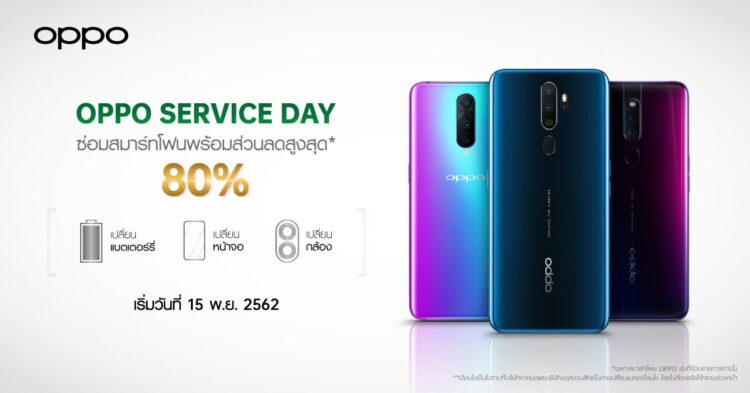 สำหรับผู้ใช้ OPPO รุ่นที่ร่วมรายการ สามารถรับส่วนลดค่าซ่อมสามาร์ทโฟนสูงสุดถึง 80% ได้ที่ OPPO Service Center ตั้งแต่วันที่ 15 พฤศจิกายน 2562 เงื่อนไขเป็นไปตามที่บริษัทฯ กำหนดและบริษัทขอสงวนสิทธิ์ในการเปลี่ยนแปลงเงื่อนไขโดยไม่แจ้งในทราบล่วงหน้า