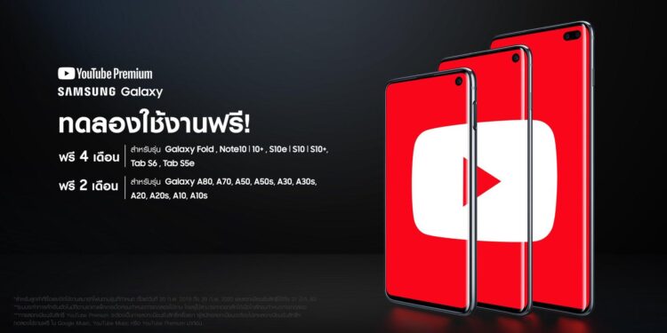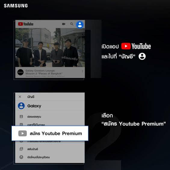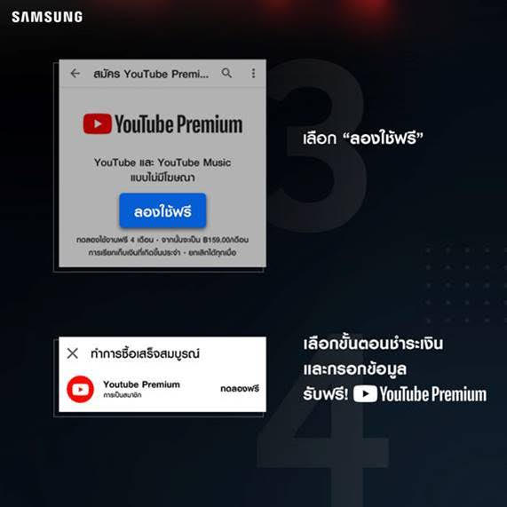 สำหรับผู้ใช้สมาร์ทโฟนซัมซุง กาแลคซี่ โฟลด์, โน้ต 10, โน้ต 10 พลัส, เอส 10, เอส 10 พลัส, เอส 10e, แท็บ เอส 6 และ แท็บ เอส 5e สามารถใช้บริการ ยูทูป พรีเมี่ยม ฟรีนาน 4 เดือน และสำหรับสมาร์ทโฟนในตระกูลกาแลคซี่ เอ ตั้งแต่ เอ 80, เอ 70, เอ 50, เอ 50 เอส, เอ 30, เอ 30 เอส, เอ 20, เอ 20 เอส, เอ 10 และ เอ 10 เอส สามารถใช้บริการได้ฟรีนาน 2 เดือน ซึ่งผู้ใช้จะต้องไม่เคยเปิดใช้บริการ ยูทูป พรีเมี่ยม มาก่อน โดยสามารถกดรับสิทธิ์ทดลองใช้งานฟรีได้แล้ววันนี้ ไปจนถึงวันที่29 กุมภาพันธ์ 2563 เพียงเปิดแอปพลิเคชันยูทูป จากนั้นไปที่ ‘บัญชี’ (Account) เลือก ‘สมัคร ยูทูป พรีเมี่ยม’ (Get YouTube Premium) และกด ‘ลองใช้ฟรี’ (Try it free) เท่านี้ก็สามารถใช้บริการ ยูทูป พรีเมี่ยม ได้ทันที ดูรายละเอียดและเงื่อนไขเพิ่มเติมได้ที่ https://bit.ly/374PwXR