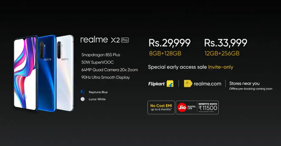 realme X2Pro มีให้เลือก 2 สี Lunar White และ Neptune Blue ราคาเริ่มต้น 29,999 รูปี หรือราว 12,600 บาท สำหรับรุ่น RAM 8GB + ROM 128GB และราคา 33,999 รูปี หรือราว 14,300 บาท สำหรับรุ่น RAM 12GB + ROM 256GB