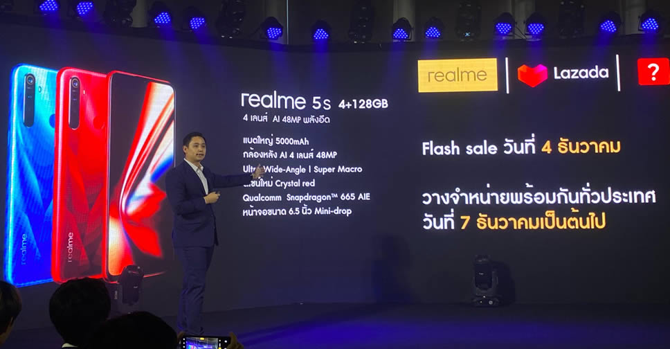 realme แนะนำสมาร์ทโฟน realme 5s บนเวทีเปิดตัว realme X2 Pro ในประเทศไทย โดยยังไม่มีการประกาศราคาออกมา แต่ยืนยันว่าจะเริ่มวางจำหน่ายในรูปแบบแฟลชเซลล์ผ่าน Lazada ในวันที่ 4 ธันวาคมนี้ ก่อนจะเริ่มวางจำหน่ายทั่วประเทศตั้งแต่วันที่ 7 ธันวาคม 2562 เป็นต้นไป