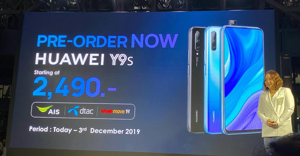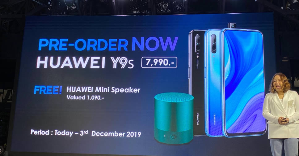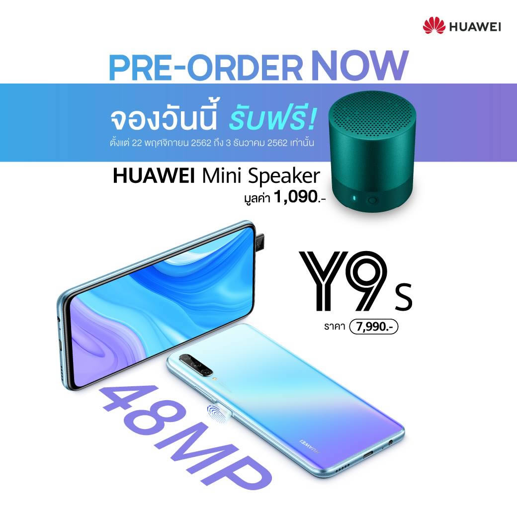 HUAWEI เปิดรับจองสมาร์ทโฟน Y9s อย่างทางการ ตั้งแต่วันนี้ ไปจนถึงวันที่ 3 ธันวาคมนี้ ก่อนจะวางจำหน่ายในวันที่ 4 ธันวาคม 2562 เป็นต้นไป ราคา 7,990 บาท โดยผู้ที่สั่งจองในช่วงเวลาดังกล่าว จะได้รับลำโพง HUAWEI Mini Speaker จำนวน 1 ชิ้น มูลค่า 1,090 บาท เป็นของแถม
