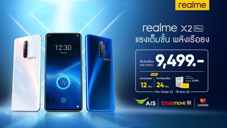 สำหรับ realme X2 Pro วางจำหน่ายในราคาเริ่มต้นที่ 19,999 บาท และเปิดให้ Pre – order แล้ววันนี้ จนถึงวันที่ 30 พฤศจิกายน พร้อมของแถม VIP Card ประกันหน้าจอ 1 ปี ประกันตัวเครื่องนาน 2 ปี และ realme Buds Wireless รวมมูลค่ากว่า 10,999 บาท เริ่มวางจำหน่ายอย่างเป็นทางการวันที่ 1 ธันวาคมนี้ ที่ AIS, True Move H, CSC, Com7, Jaymart, TG Fone และ IT City ช่องทางออนไลน์ที่ Lazada สอบถามข้อมูลเพิ่มเติมได้ที่ www.facebook.com/realmeTH/