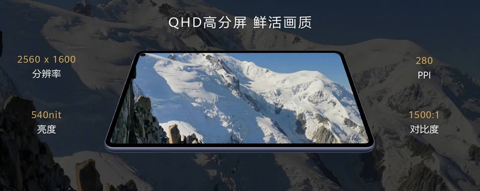 Huawei MatePad Pro มาพร้อมจอแสดงผล QHD (2560 x 1600 พิกเซล) ขนาด 10.8 นิ้ว อัตราส่วนภาพ 16:9 สัดส่วนหน้าจอต่อบอดี้ 90% ด้วยขอบจอที่บางกว่าคู่แข่ง เพียง 4.9 มิลลิเมตร จอแสดงผลยังให้ความสว่างสูงสุด 540 นิตส์ และสนับสนุนขอบเขตของสี DCI-P3