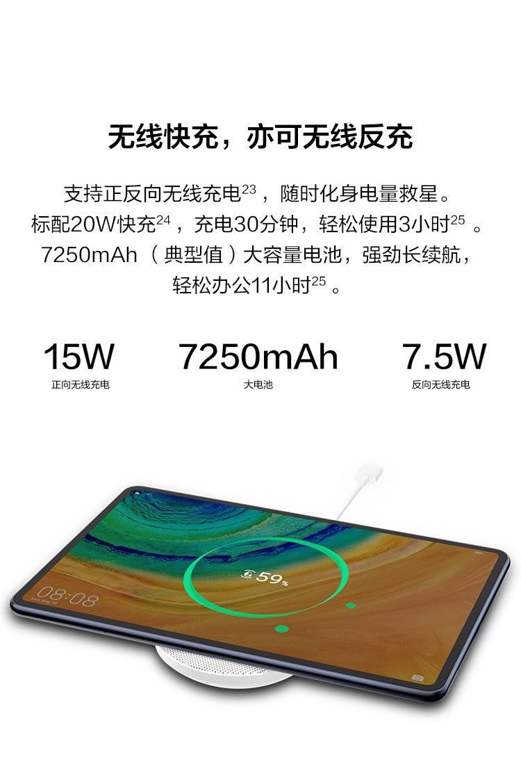 Huawei MatePad Pro สนับสนุน Reverse Wireless Charging ซึ่งหมายถึงสามารถชาร์จแบตเตอรี่ให้กับอุปกรณ์อื่นๆ ได้ เพียงนำมาวางไว้ที่ด้านหลังของแท็บเล็ต ไม่ว่าจะเป็นสมาร์ทวอทช์ สมาร์ทโฟน หูฟังไร้สาย และอุปกรณ์อื่นๆ ที่รองรับการชาร์จแบบไร้สาย