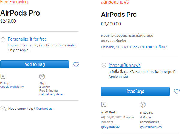 สำหรับระบบออนไลน์ของ Apple ในประเทศไทย ระบุว่าจะพร้อมจัดส่ง AirPods Pro ในอีก 4 สัปดาห์ข้างหน้าเช่นกัน และคาดว่าผู้ที่สั่งซื้อในวันที่ 28 พฤศจิกายน จะได้รับสินค้าในวันที่ 2 มกราคม 2563