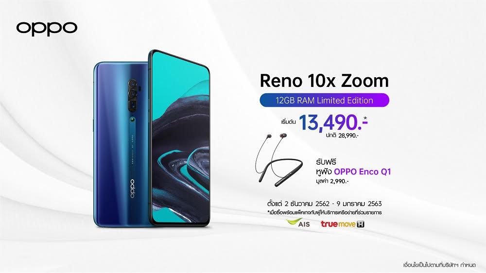 OPPO Reno 10x Zoom สมาร์ทโฟนสุดพรีเมี่ยมจาก OPPO โดดเด่นในด้านของประสิทธิภาพการทำงานที่รวดเร็ว และเทคโนโลยีกล้องสุดล้ำ อย่างเทคโนโลยี 10x Hybrid Zoom ซูม 10 เท่า โดยที่ภาพยังคมชัด และดิจิทัลซูมได้สูงสุด 60 เท่า วันนี้ OPPO กลับมาตอกย้ำความเป็นผู้นำด้านสมาร์ทโฟนอีกครั้งด้วยการเปิดตัว OPPO Reno 10x Zoom 12GB RAM Limited Edition ในราคาเท่าเดิม 28,990 บาท พร้อมวางจำหน่ายอย่างเป็นทางการวันที่ 2 ธันวาคมนี้ ณ OPPO Brand Shop ทุกสาขาและตัวแทนจำหน่ายทั่วประเทศ พร้อมรับข้อเสนอพิเศษ เริ่มต้นเพียง 13,490 บาท เมื่อซื้อพร้อมแพ็คเกจกับผู้ให้บริการเครือข่ายที่ร่วมรายการ ทั้ง AIS (โปรโมชั่นถึงวันที่ 9 มกราคม 2563) และ Truemove H (โปรโมชั่นถึงวันที่ 31ธันวาคม 2562) สำหรับผู้ที่ทำการซื้อ OPPO Reno 10x Zoom 12GB RAM Limited Edition รับฟรี OPPO Enco Q1 Wireless Noise Cancelling Headphones ไปเลยทันที มูลค่า 2,990 บาท