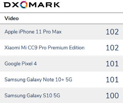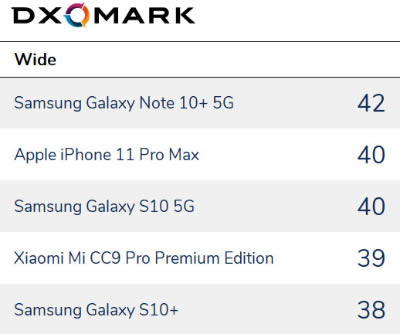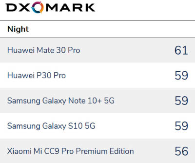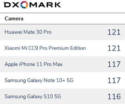 Huawei Mate 30 Pro และ Xiaomi Mi CC9 Pro Premium Edition ถูกยกให้เป็นสมาร์ทโฟนที่มีกล้องหลังดีที่สุดเท่าที่เคยผ่านมือทีมงานของ DxOMark สมาร์ทโฟนทั้ง 2 รุ่น ทำคะแนนรวมเท่ากันที่ 121 คะแนน ถือเป็นตัวเลือกที่ยอดเยี่ยมสำหรับผู้ใช้งานที่ต้องการประสิทธิภาพระดับสูงในการถ่ายภาพได้ทุกสถานการณ์ ไม่ว่าจะเป็นภาพนิ่งหรือวิดีโอ