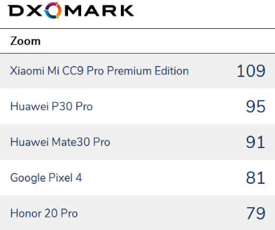 Xiaomi Mi CC9 Pro Premium Edition ยืนหนึ่งในหมวดหมู่ Best for zoom ทีมงงาน DxOMark ยอมรับว่าระบบซูมของ Mi CC9 Pro Premium Edition มีประสิทธิภาพใกล้เคียงกับกล้องจริง โดยใช้กล้องเทเลโฟโต้ 2 ตัว ที่มีทางยาวโฟกัสแตกต่างกัน ทำให้ได้ภาพเทเลโฟโต้คุณภาพสูงในทุกช่วงความยาวโฟกัสที่ DxOMark ได้ทดสอบ