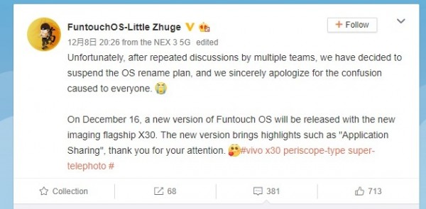 ล่าสุด Vivo ได้ออกมายืนยันแล้วว่า จะไม่มีการเปลี่ยนชื่ออย่างแน่นอน สมาร์ทโฟนในอนาคตของ Vivo ยังคงมาพร้อม Funtouch OS และกำลังจะมีเวอร์ชั่นใหม่ออกมาพร้อมกับสมาร์ทโฟน Vivo X30 ที่จะเปิดตัวในวันที่ 16 ธันวาคมนี้