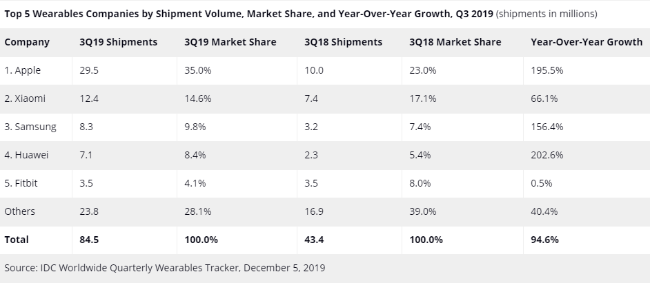 IDC (International Data Corporation) รายงานยอดจัดส่งและส่วนแบ่งในตลาดอุปกรณ์สวมใส่ทั่วโลก ในช่วงไตรมาสที่ 3 ปี 2019 (กรกฎาคม – กันยายน) พบว่าตลาดอุปกรณ์สวมใส่โดยรวมเติบโตขึ้น 94.6% เมื่อเทียบกับไตรมาสเดียวกันของปี 2018 ด้วยยอดจัดส่ง 84.5 ล้านเครื่อง