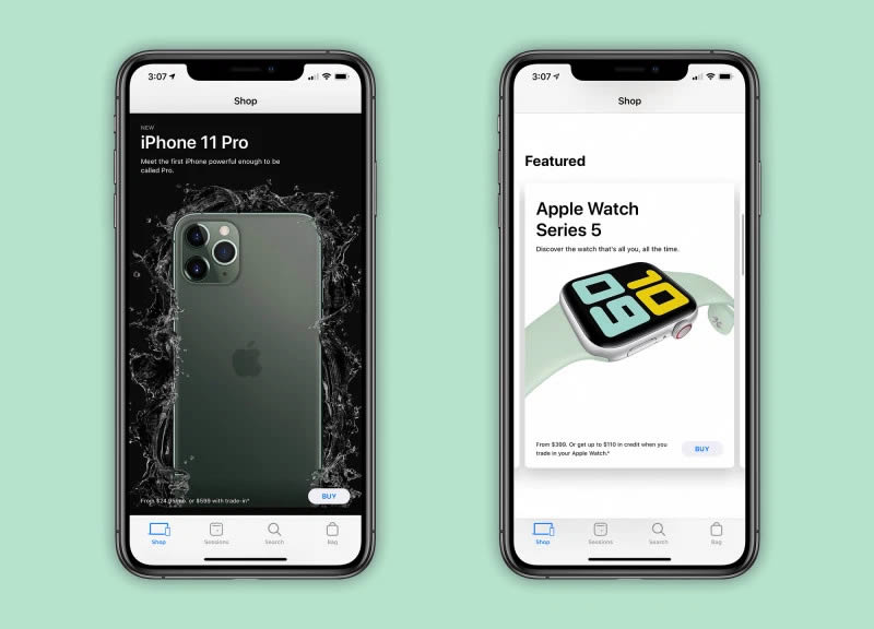 แอพ Apple Store เวอร์ชั่นล่าสุด มาพร้อมแท็บ Discover และ Shop ไว้ใน User Interface แบบการ์ด และในส่วนของไฮไลท์ผลิตภัณฑ์ใหม่ อีกทั้งยังเพิ่มหมวดหมู่รายการสินค้า และผลิตภัณฑ์ที่เป็นเจ้าของอยู่แล้ว