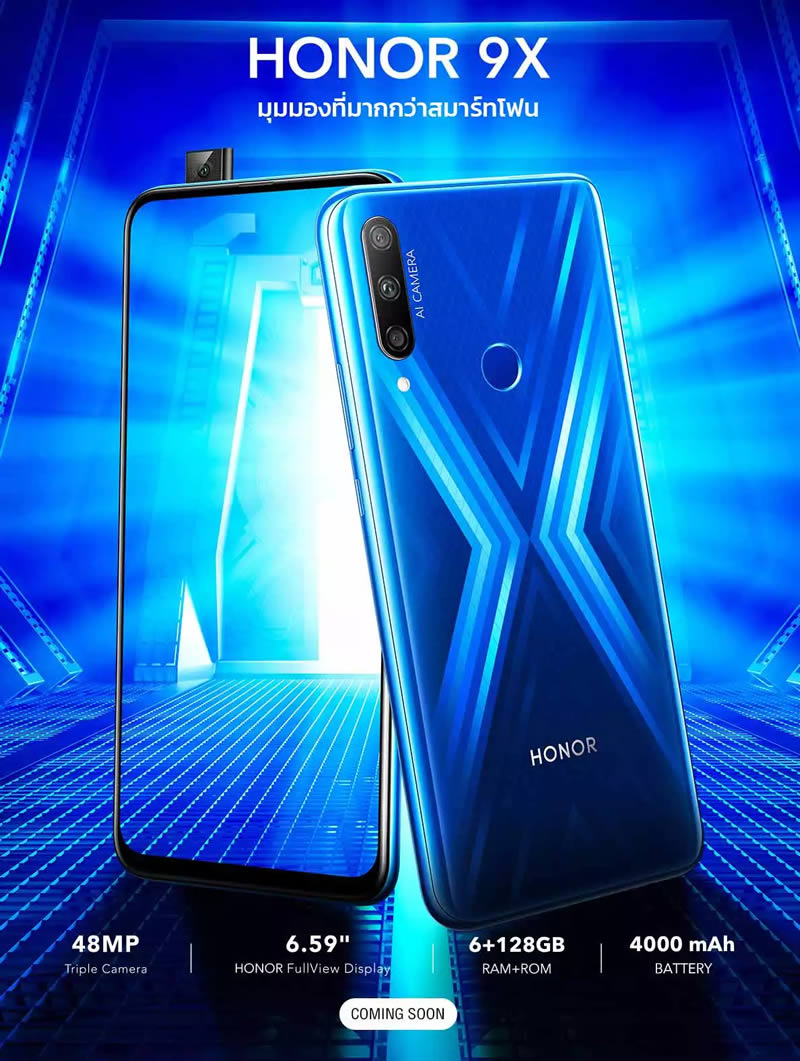 Honor เปิดตัวสมาร์ทโฟน Honor 9X ในไทยอย่างทางการ โดยชูจุดเด่นที่จอแสดงผล FullView Display กว้าง 6.59 นิ้ว กล้องหลัง 3 ตัว 48MP Triple Camera กล้องเซลฟี่ 16 ล้านพิกเซล แบบป๊อปอัพ ทำให้จอแสดงผลไม่มีรอยบากรบกวนสายตา