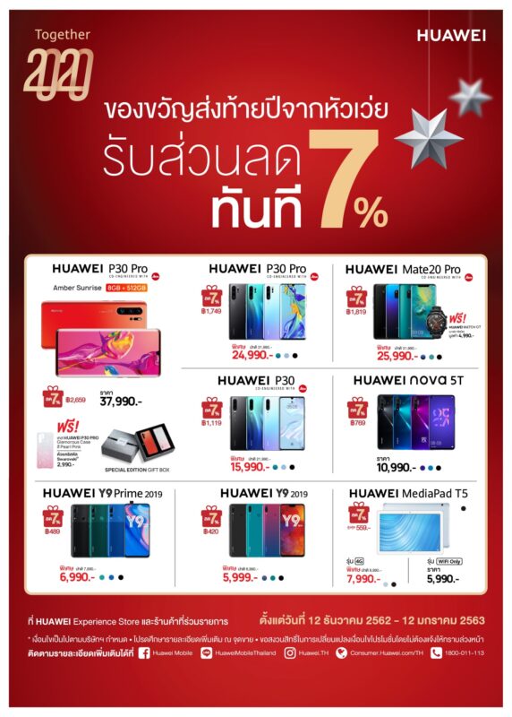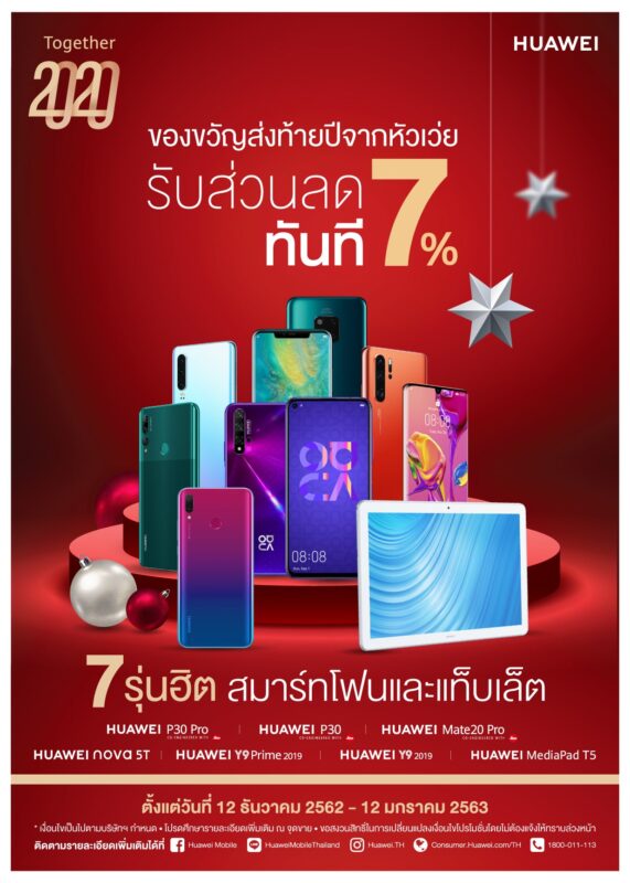 พบกับกองทัพสมาร์ทโฟนและแท็บเล็ต 7 รุ่นฮิต และรับส่วนลดเพิ่มทันทีอีก 7% พร้อมร่วมลุ้นรางวัลใหญ่ในแคมเปญ Together 2020 ได้แล้ว ตั้งแต่วันนี้ – 12 มกราคม 2020 ณ Huawei Experience Store และร้านค้าที่ร่วมรายการ