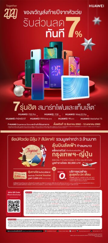 หัวเว่ยมอบของขวัญส่งท้ายปี เสริมทัพแคมเปญ “Together 2020” ด้วยส่วนลดเพิ่มทันที 7% สำหรับสมาร์ทโฟนและแท็บเล็ต 7 รุ่นสุดฮิต พร้อมรับสิทธิ์ลุ้นบินลัดฟ้า ท้าลมหนาวกับแพ็กเกจทัวร์ กรุงเทพ-ญี่ปุ่น ทุกสัปดาห์ เริ่มแล้ว วันนี้ ถึง 12 มกราคมนี้ Huawei Experience Store และร้านค้าที่ร่วมรายการ