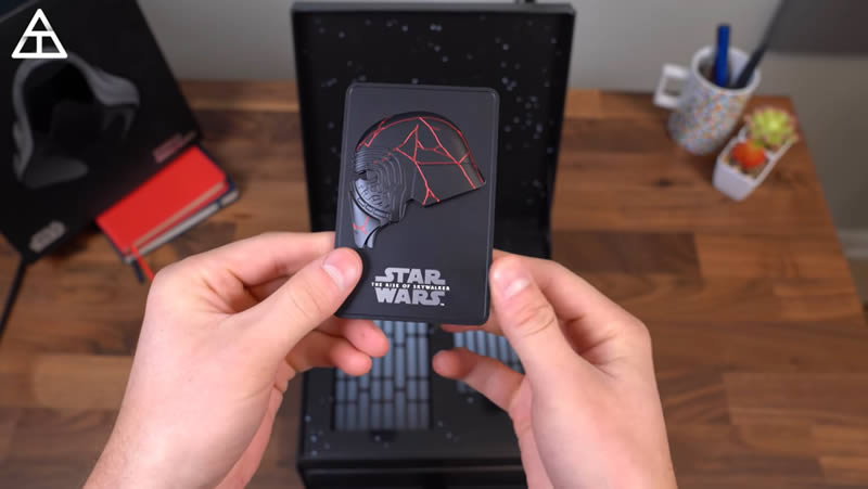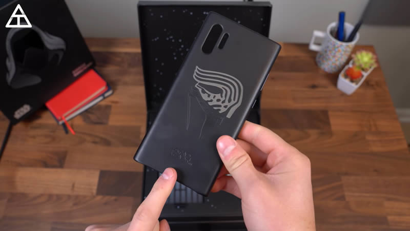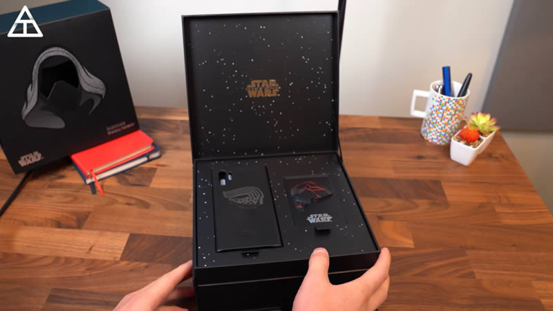 กล่องของ Samsung Galaxy Note10+ Star Wars Special Edition ถูกออกแบบมาเป็นอย่างดี โดยภายในยังคงสีดำ แต่มีจุดสีขาวอยู่ทั่วไป คล้ายกับฉากของจักรวาลนั่นเอง และเมื่อเปิดฝากล่องขึ้นมา สิ่งแรกที่เจอคือเคสสีดำ ที่มีลายหน้ากากของ Kylo Ren แบบหันข้าง ด้านในเคสมีโลโก้ของกลุ่มปฐมภาคี หรือ First Order ส่วนที่วางอยู่ข้างเคสคือของที่ระลึก เป็นป้ายที่มีหน้ากากของ Kylo Ren แบบพิพมพ์นูน พร้อมโลโก้ Star Wars: The Rise of Skywalker