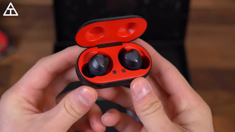 หูฟังไร้สาย Galaxy Buds ที่แถมมาให้ อยู่ในเคสสีดำ แต่ภายในเป็นสีแดง ตัวหูฟังทั้ง 2 ข้างใช้สีดำ